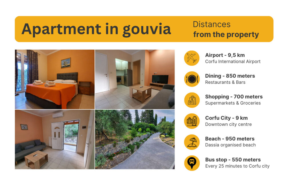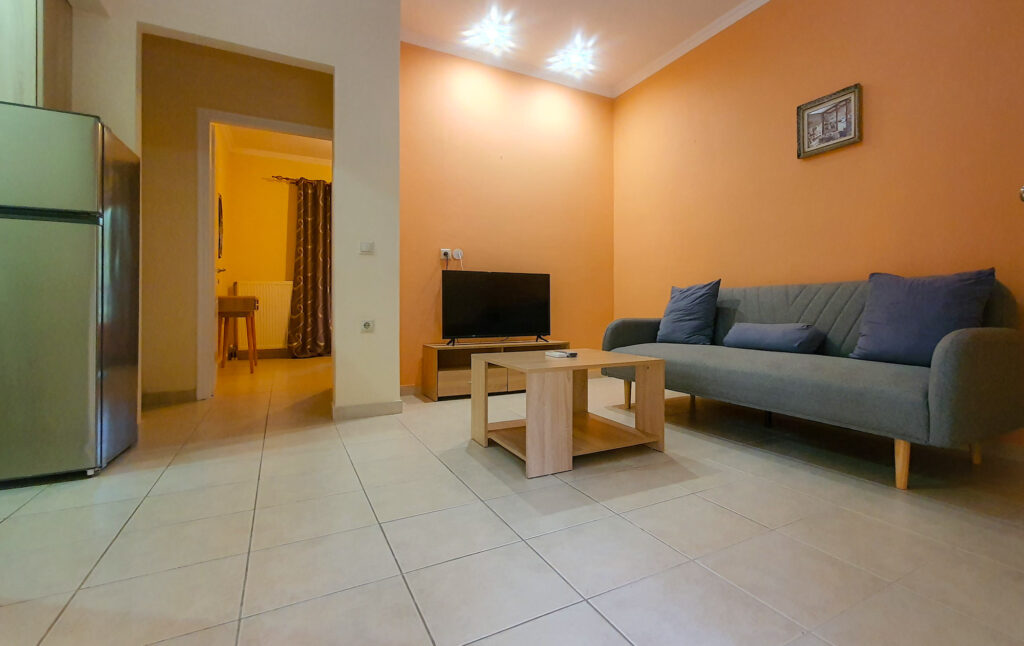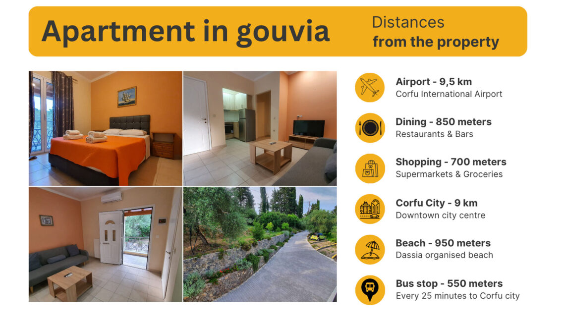 This charming apartment near the marina of Gouvia is the perfect choice for a comfortable stay in Corfu. With its one bedroom, it can accommodate up to three persons, making it ideal for a couple or a small family. The apartment features a cozy living room, where you can relax and unwind after a day of exploring the island. There is also a balcony, where you can enjoy your morning coffee or an evening drink while admiring our gardens.